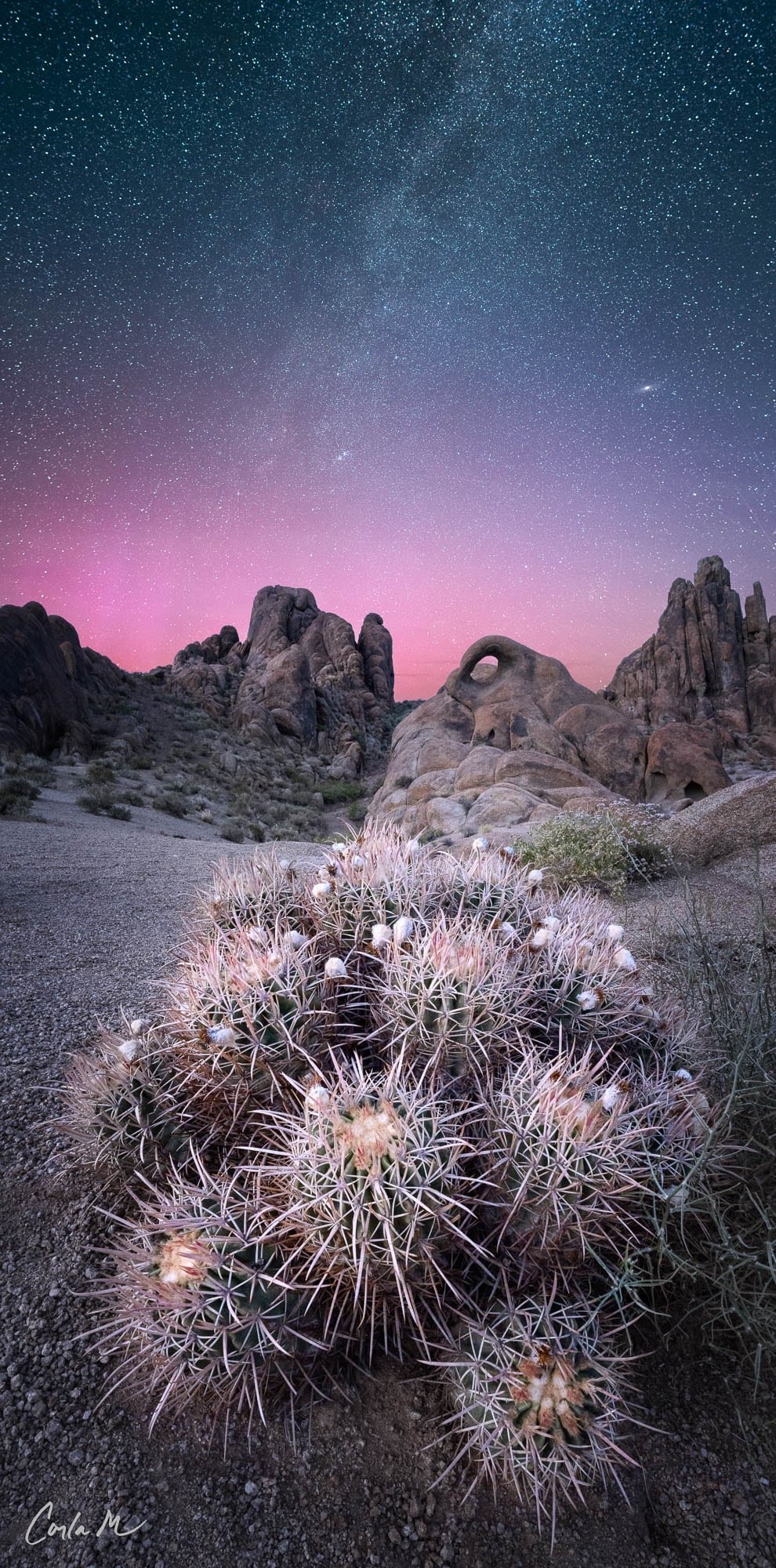 The Alabama Hills are known for arches and lumpy boulders incongruously placed before the sheer cliffs of the Sierras and Mount Whitney. This arch is also known for this perfectly shaped barrel cactus, that make the perfect subject for a “near-far” landscape image. I like a good near-far, and I was excited to have my chance at this one, when I got a totally fantastic surprise – the aurora was dancing in the sky. What luck! This image was captured with a 14mm lens, focus stacking the foreground, and then putting on a tracker to get the stars extra crisp for the sky.