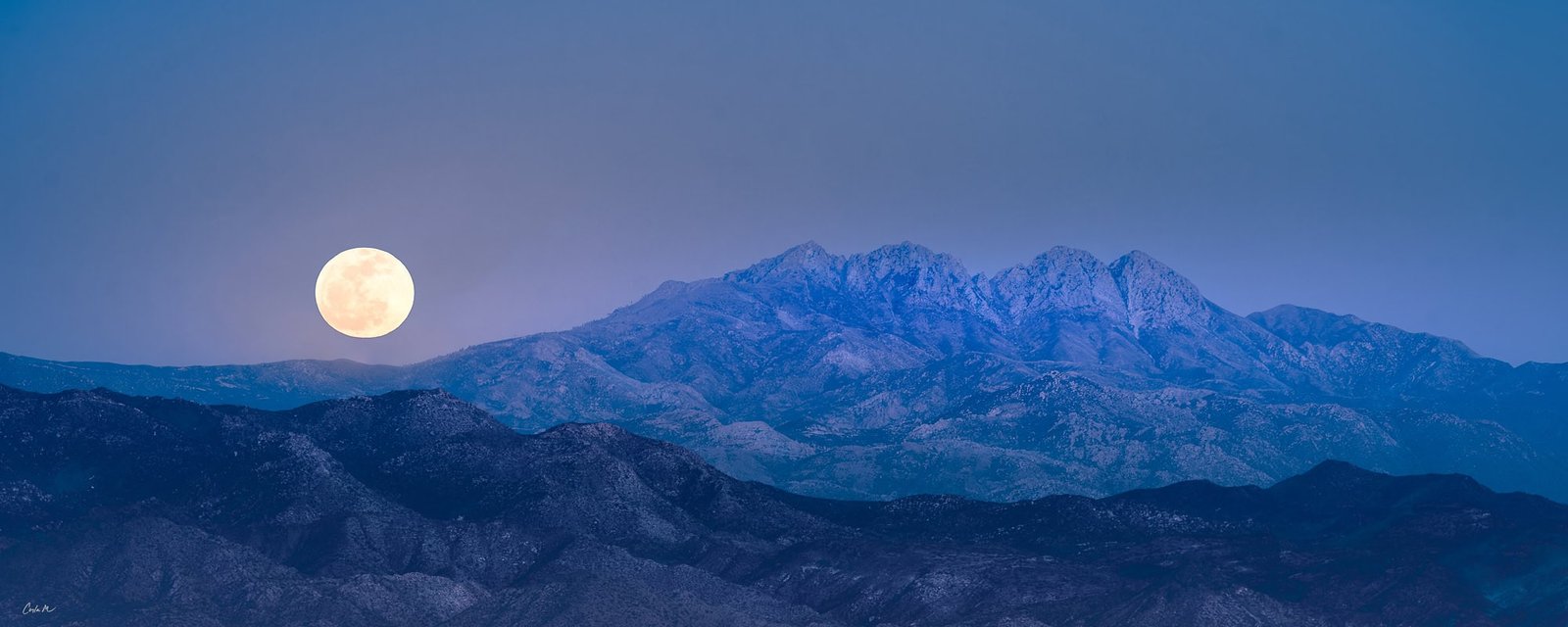 The full moon rises in regal blue glory, crowning Four Peaks and blessing the verdant Sonoran Desert. For Carla Meeske, capturing this image was pure delight. The Four Peaks are sacred mountains, and getting the moon at the perfect time, with the perfect atmosphere to dress the mountains was magical! Taken off Bartlett Lake Road, Tonto National Forest, Scottsdale, AZ.
