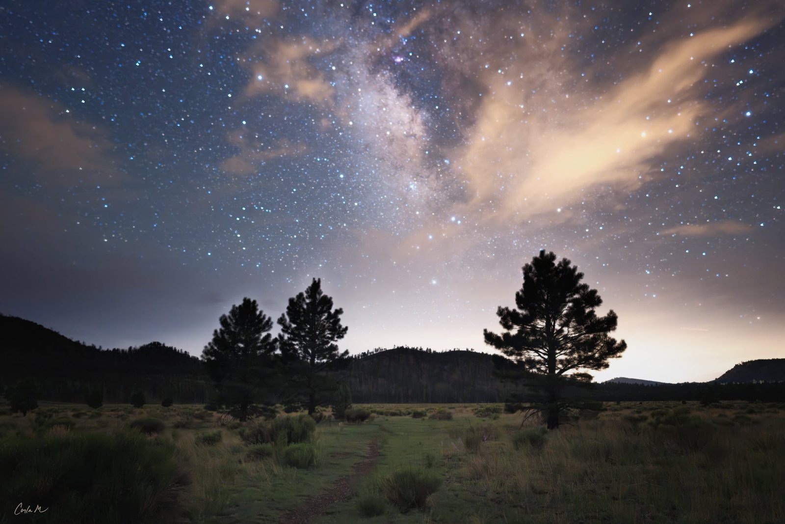 A soft trail leads through the meadow to the gentle mountains, draped in a cloudy Milky Way. This is Bonita Meadows at Sunset National Monument under the San Francisco Peaks in Flagstaff, AZ. The skies are exquisitely dark and beautiful. This welcoming landscape is one of Carla’s favorite places in Northern Arizona.
