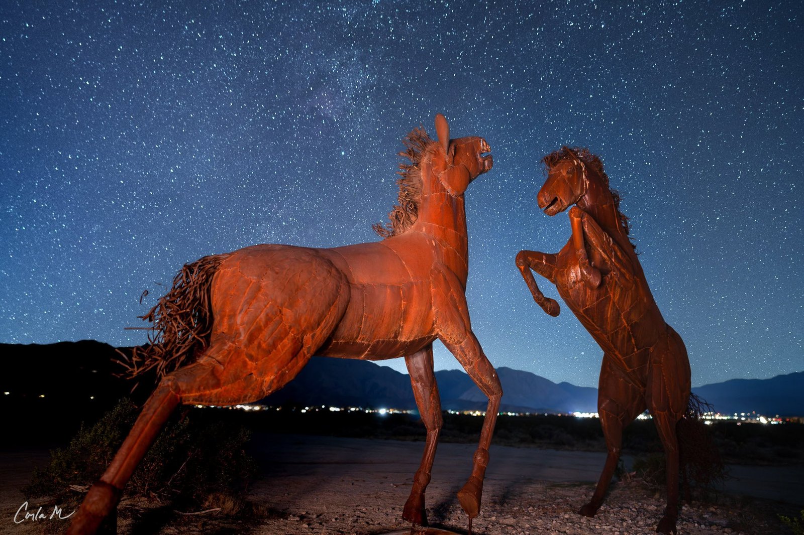 Experience the dramatic artistry of Anza-Borrego’s famous metal horse sculptures captured under brilliant starry skies in this unique night photography from California’s largest state park. In Night Fight, two magnificent stallions clash their hooves in eternal combat beneath the desert stars. Warm lighting on the metal horses creates a striking contrast against the deep blue night sky filled with countless stars. In her Anza series, Carla Meeske captures the unique metal sculptures around the Anza-Borrego Desert State Park, in the dark of night, bringing them to life. Perfect for art lovers and night sky enthusiasts, this fine art metal print captures the power and beauty of these iconic desert sculptures standing eternal vigil under the cosmos.