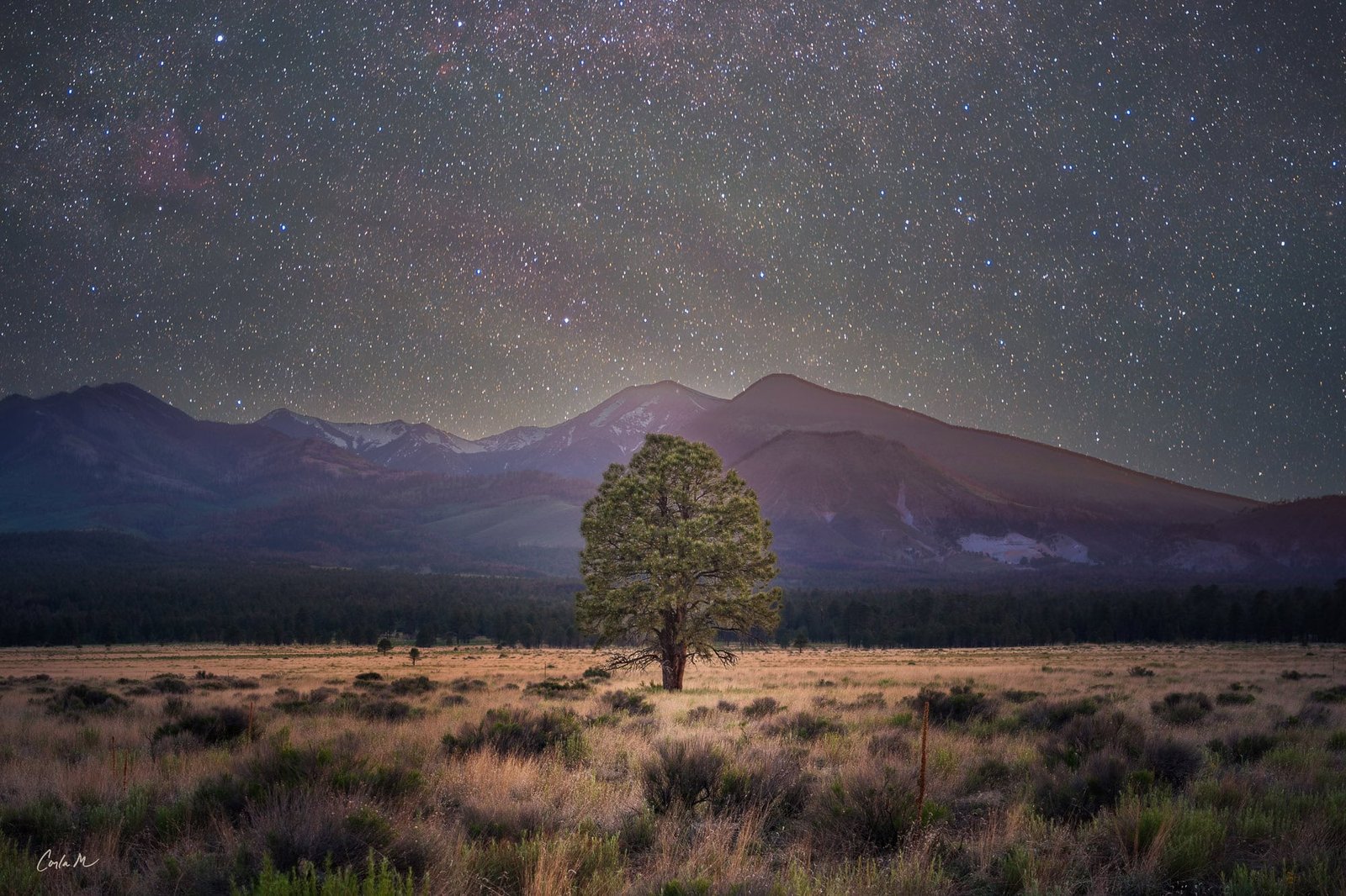 The San Francisco Peaks (Dookʼoʼoosłííd) are sacred to all the native people of the area, holding the direction of the west for the Navajo and the Southwest for the Hopi. They hold power that brings magic and wisdom into our all our lives. A single Ponderosa Pine stands in tribute to their majesty. I have a mission to photograph the sacred mountains with important Navajo contellations above them, and share them with my Diné friends. on the Navajo Nation